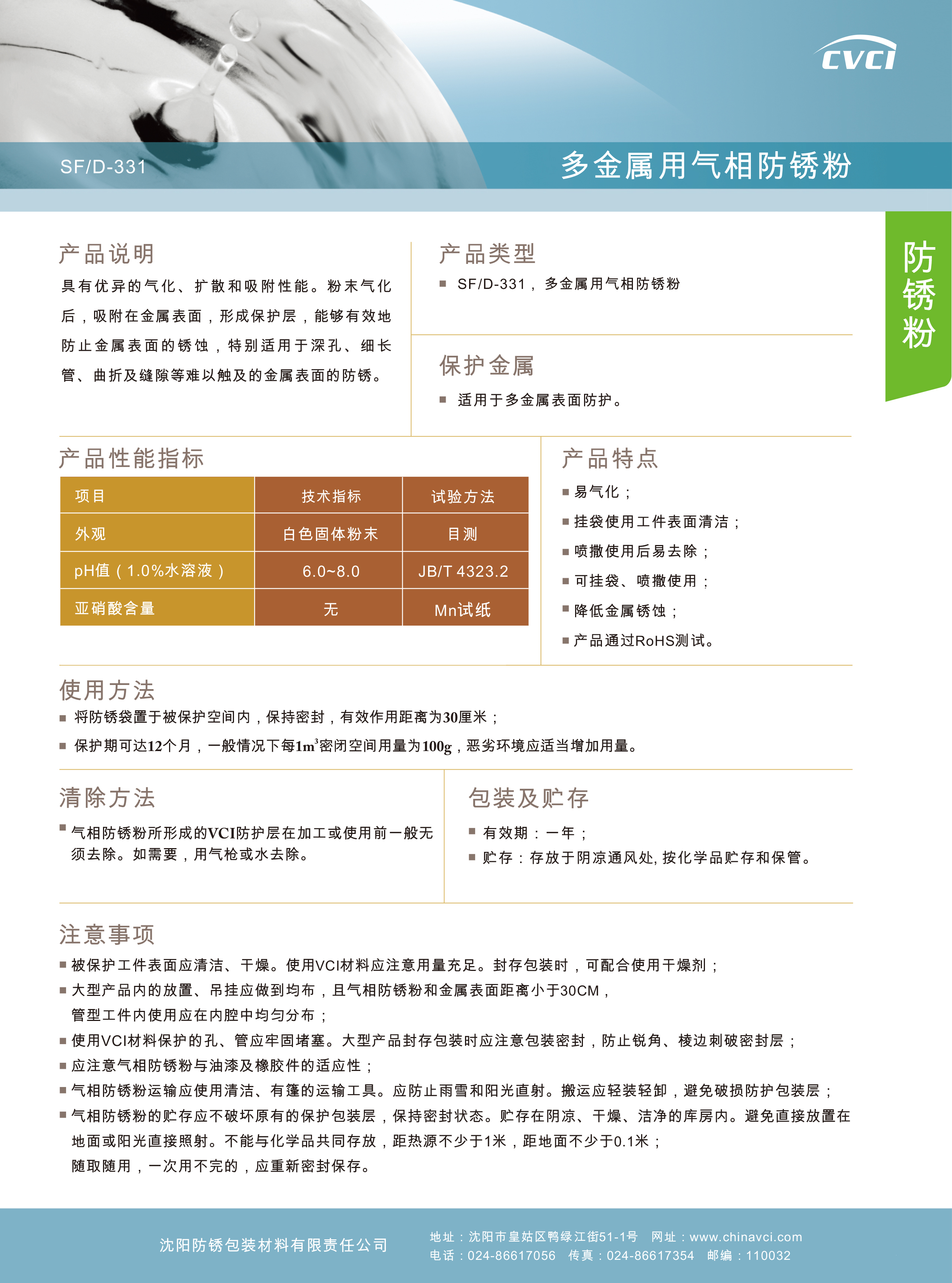 產(chǎn)品說明:多金屬用氣相防銹粉,具有優(yōu)異的氣化、擴散和吸附性能。粉末氣化后,吸附在被保護(hù)金屬表面,形成保護(hù)層,能夠非常有效地防止金屬表面的銹蝕,特別適用于深孔、細(xì)長管、曲折及縫隙等難以觸及的金屬表面的防銹。