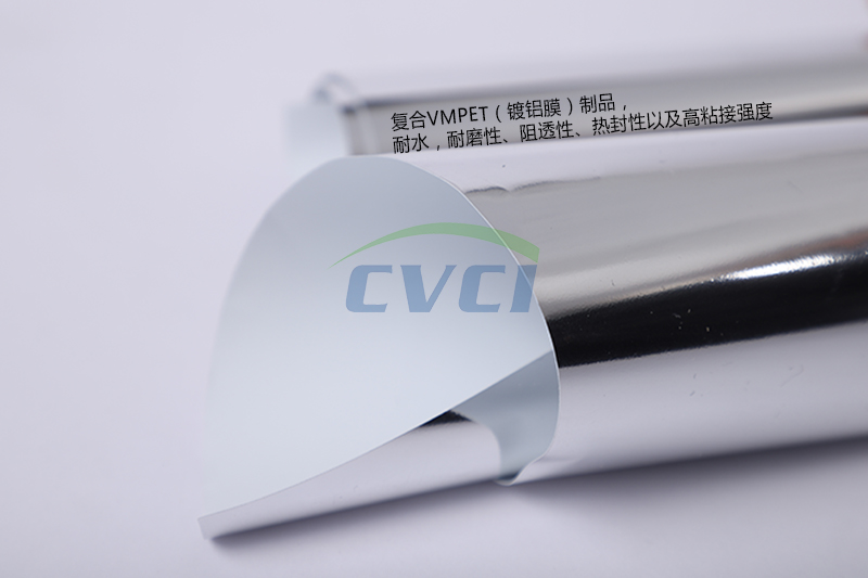 復(fù)合VMPET(鍍鋁膜)制品,具有耐水,耐磨性、阻透性、熱封性以及高粘接強(qiáng)度,對紫外和紅外光具有良好反射性等產(chǎn)品特性。阻隔性性能指標(biāo)為:氧氣透過量cm3/(m2? 24h? 0.1Mpa)≤1.5,水蒸氣透過量(g/m2?24h)≤1.5。