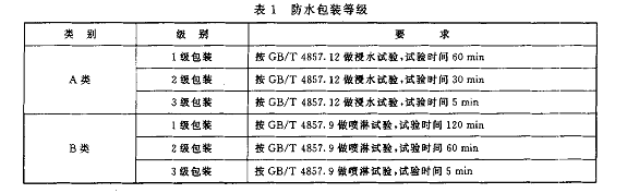 防水包裝等級(jí)分為A類(lèi)1級(jí)包裝、2級(jí)包裝、3級(jí)包裝和B類(lèi)1級(jí)包裝、2級(jí)包裝、3級(jí)包裝,詳見(jiàn)表1.